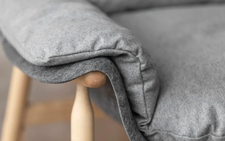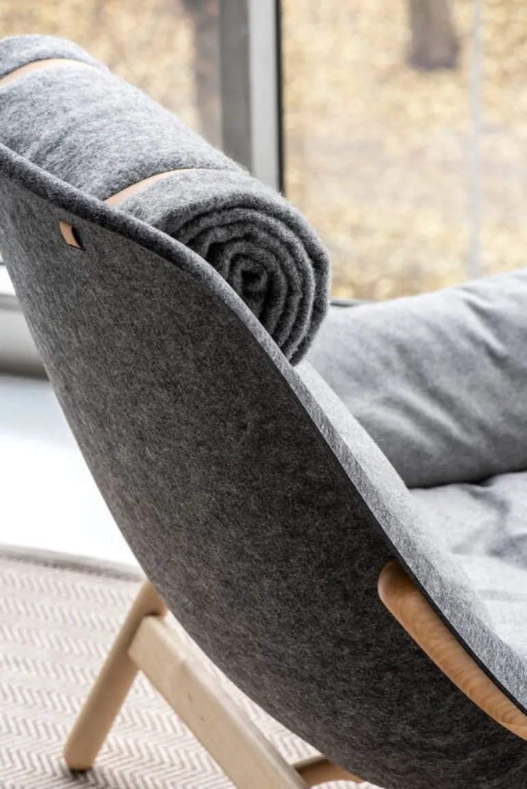 The Filtti L easy chair has an invitingly wide, form-pressed felt seat made from recycled polyester, and the frame is crafted from solid birch. Filled with a feather-foam mix and upholstered in a wool blend fabric, the removable cushions bring the lounging experience to the next level. The neck pillow of the Filtti L armchair is a rolled-up wool blanket, which is fastened to the seat with recycled leather straps.