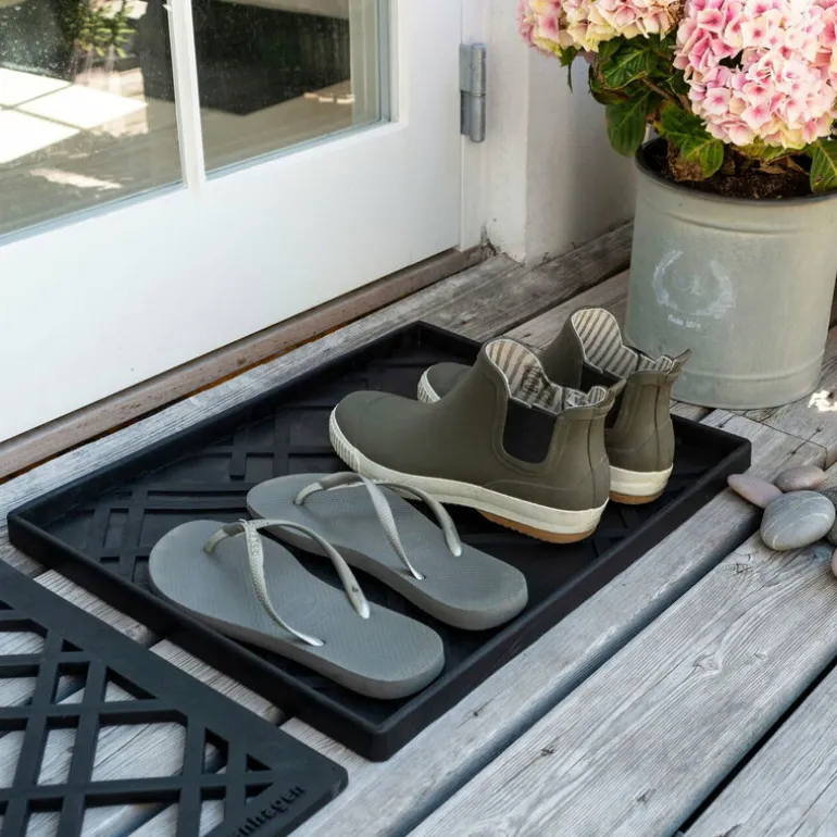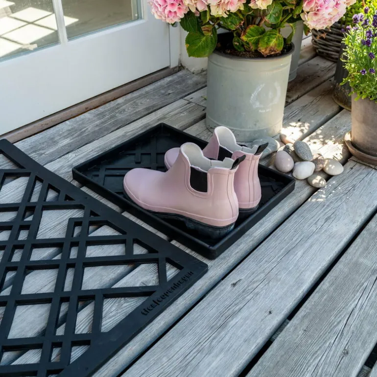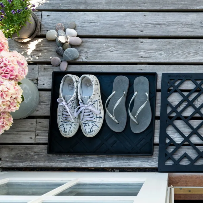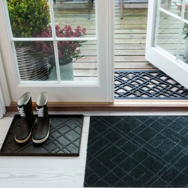 Made of dense rubber the Lines shoe mat stays firmly in place on all types of surfaces and is easy to clean by vacuuming or rinsing.