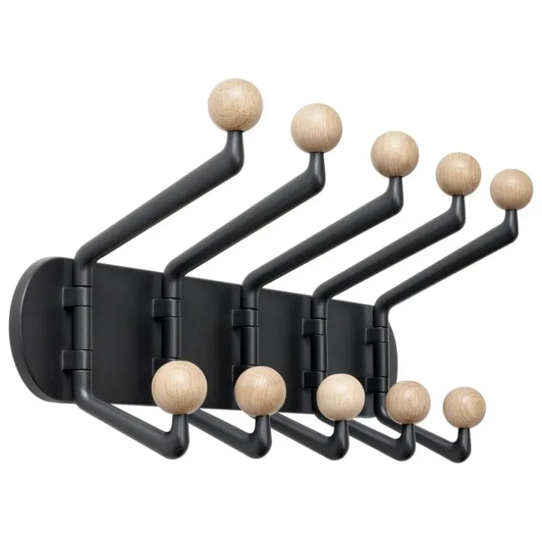 &Tradition’s Capture SC76 wall hanger, designed by Space Copenhagen, is a multifunctional 10-armed hanger that can be used in the bathroom or kitchen as a towel rack or in the hallway as a coat rack. The metal parts of the Capture wall hanger are made of powder-coated aluminum, and the round knobs are crafted from solid wood. The ten rotating arms make the Capture hanger a versatile and adjustable storage solution for any space.
