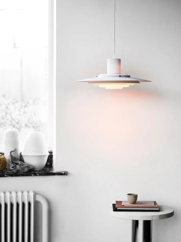 P376 KF1 pendant perfectly embodies the esthetics of Danish modernism. P376 KF1 is crafted from five concentric shades that curve towards the middle to create a soft, diffused light. Due to its architectural, symmetrical silhouette, the P376 KF1 pendant fits perfectly above the dining table or as an eye-catching luminaire in the living room. The pendant was originally designed in 1963 by architects Jørgen Kastholm and Preben Juhl Fabricius.