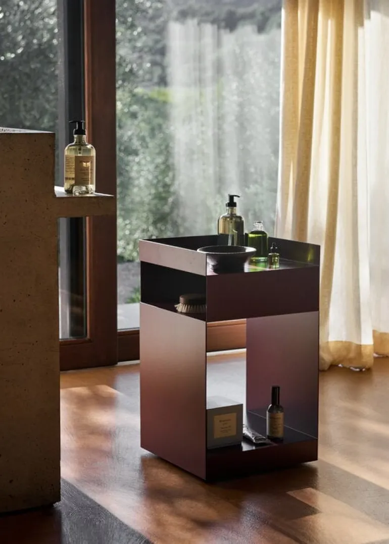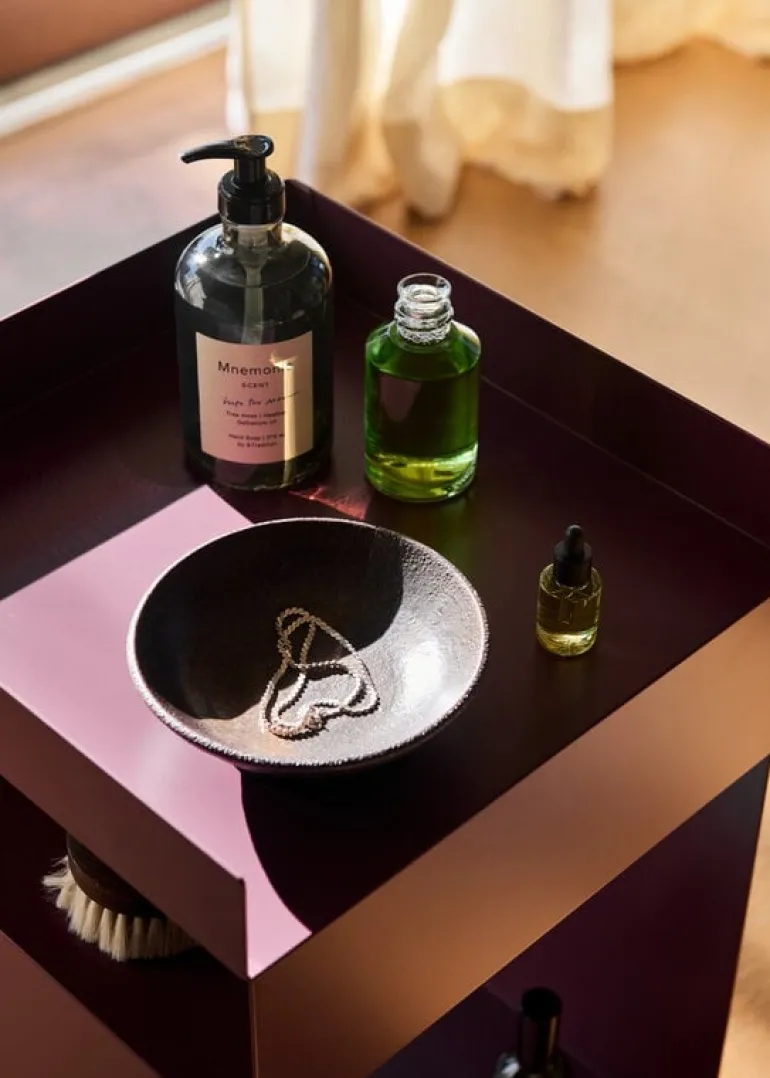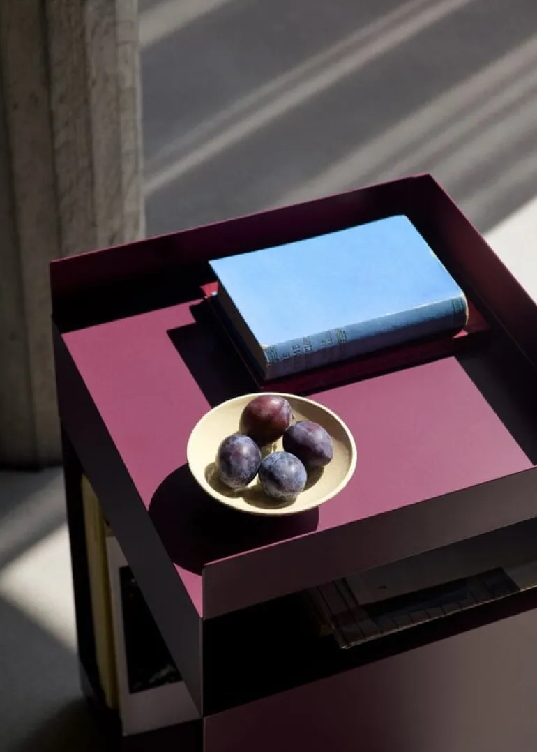 &Tradition’s Rotate side table combines a clean, geometric form with multifunctional steel compartments. Designed by Space Copenhagen, the Rotate side table is constructed of two thin metal sheets that have been bent and welded together, resulting in a large and smaller storage compartment and a tabletop with edges.