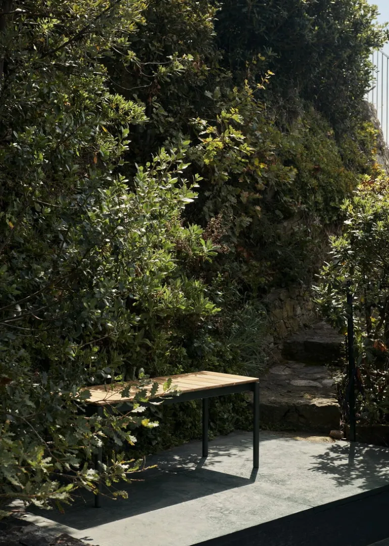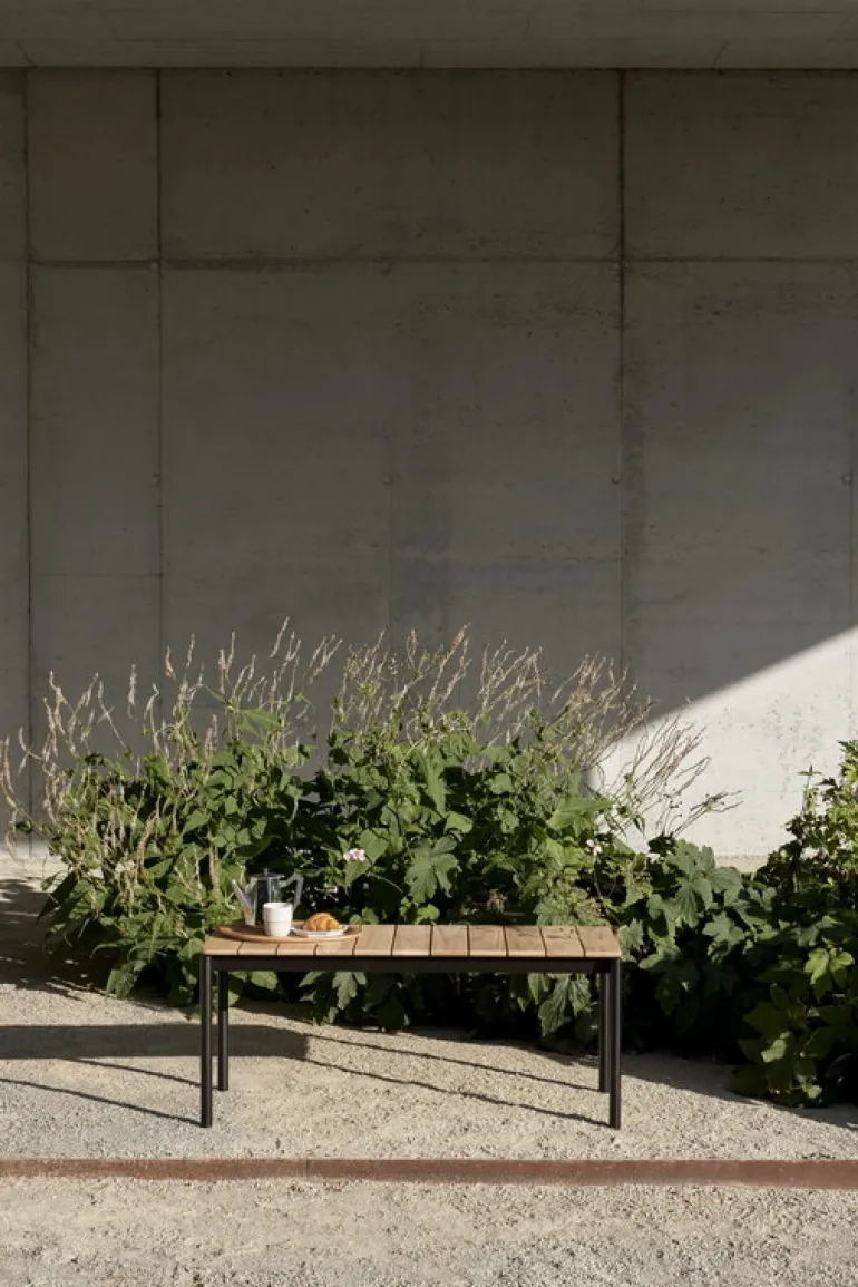&Tradition’s Ville AV27 bench pairs the sturdiness of a teak top with the sleek lines of a steel frame, striking a balance between natural elegance and minimalist strength. The teak lends an organic grace to the Ville patio bench, while the steel frame adds a touch of crisp, graphic robustness. You can either let the teak gracefully patinate to a silvery hue or keep its warm color alive with regular oiling. For a complete set, consider pairing the Ville bench with a matching table from the same series.