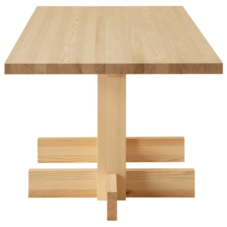 The structure of the wooden dining table is simple but distinctive: it doesn’t hide the table’s construction but, on the contrary, allows you to marvel at it as well as the skills of the craftspeople behind it. The table is crafted in Finland using Finnish pinewood. Pine is softwood, meaning that scratches and dents are bound to form on the surface. Vaarnii encourages you to embrace these imperfections and see them as characterful signs of aging that only add to the allure of the piece.