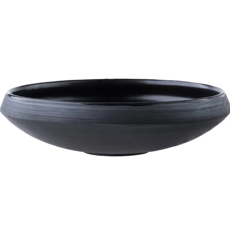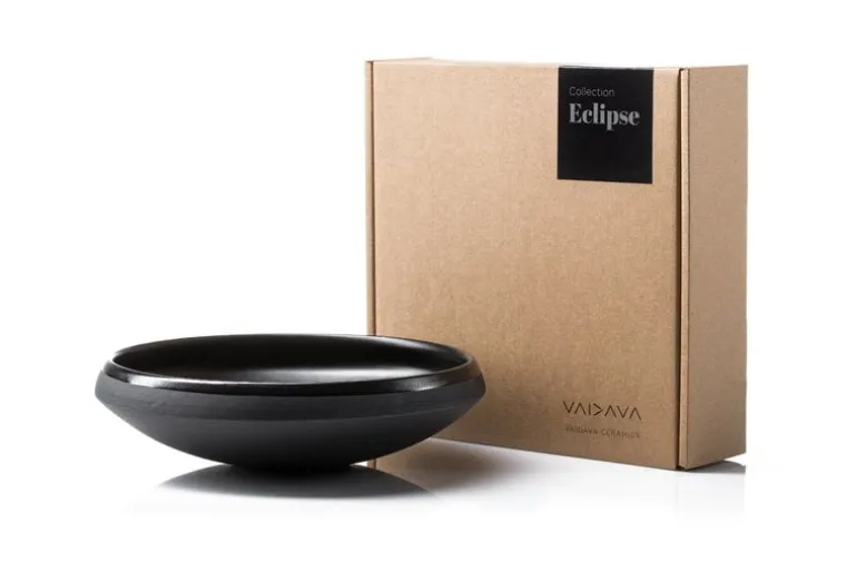 Equally suited for dining or serving, the shallow Eclipse bowl is part of a tableware collection designed by Laima Grigone for the Latvian Vaidava. The ceramic Eclipse tableware is made using Terra Sigillata technique that was developed in ancient Rome, and the inside is finished with a lead-free glaze. Characterized by clean, smooth lines and deep black color, the Eclipse range creates a stunning table setting either by itself or paired with tableware of other colors and shapes.