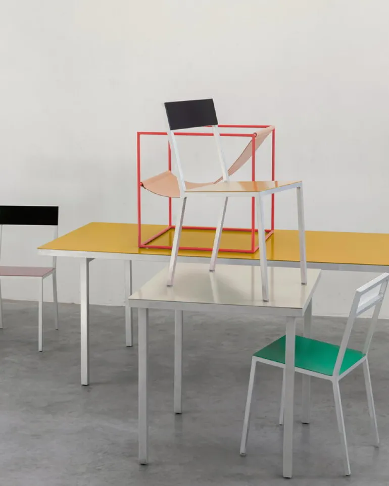 The Alu dining table by valerie objects was originally designed for the 2015 Milan World Fair. The colorful table charms with its hues but finding the right color combination for this series wasn’t so easy for the design studio Muller Van Severen. That’s why they decided to choose several different combinations, ranging from very playful colors to slightly more serious ones – but of course not too subdued. After all, it is Muller van Severen we are talking about! The colorful dining table combines beautifully with the chairs of the Alu range.