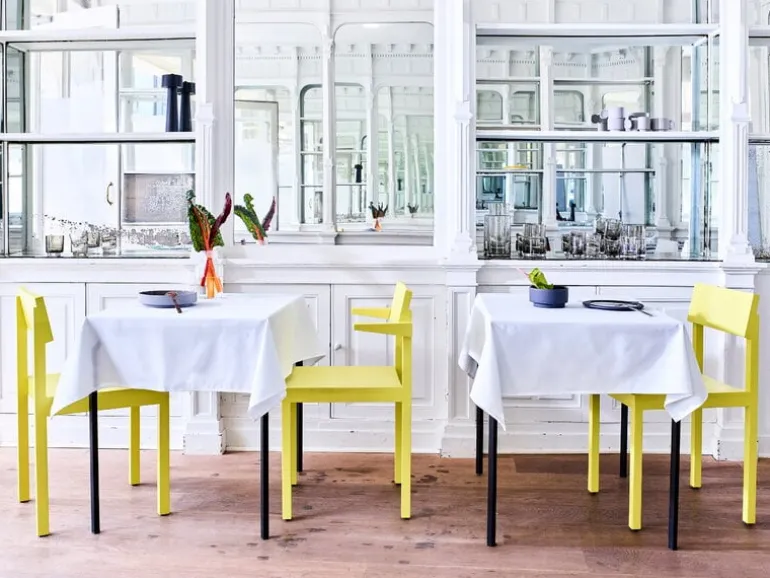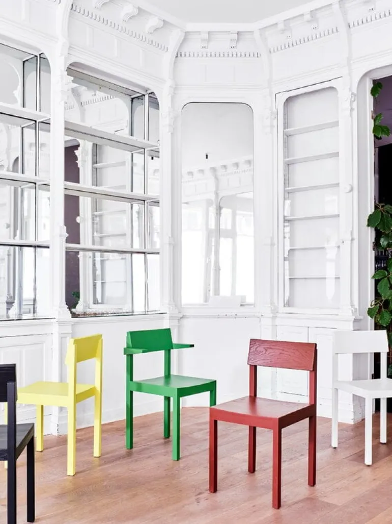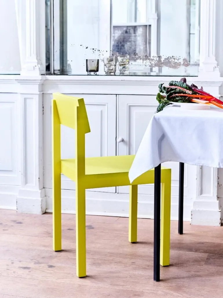 Silent chair by valerie objects has been stripped of all the extra. Designed by BIG-GAME, the Silent collection was born from the designer trio’s desire to create something quiet in a world where there is already enough noise. In search of inspiration, their journey led them to the real chapel of silence: a church. The minimalist design of the Silent chair is a take on the classic church chair, with a modern twist. The contemporary touch is crowned by the seat’s color, which could be described as anything but quiet – so bright and lively it is! Made of solid wood, the seat is the perfect match for other chairs and tables of the Silent collection, but its simple look complements other dining groups and furniture, too.
