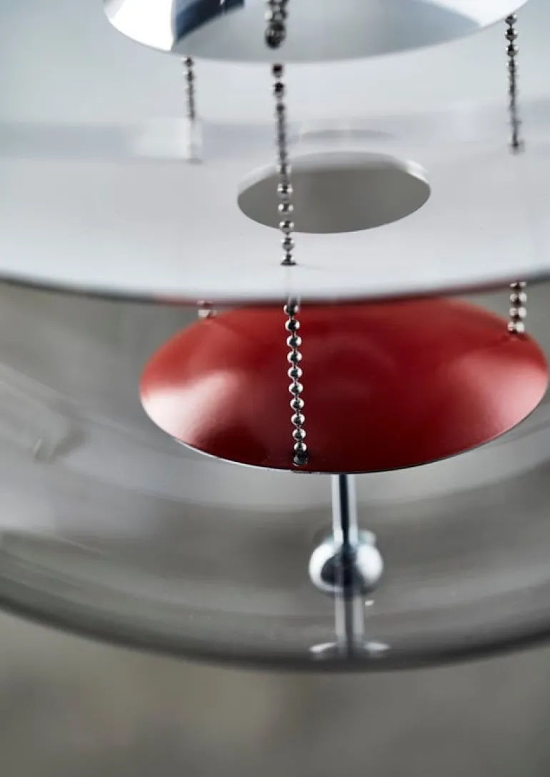 Designed by Verner Panton in 1969 and today manufactured by Verpan, the VP Globe pendant is a unique example of Panton’s skills as a lighting designer. VP Globe consists of a transparent acrylic sphere and five reflectors suspended by steel chains. The acrylic dome creates a magical bubble around the hand-polished aluminum reflectors that play with the surrounding shapes and the red and blue accent colors. VP Globe is a skilful study about the interaction between form, light and color, and it catches the eye for instance above the dining table or in the living room.