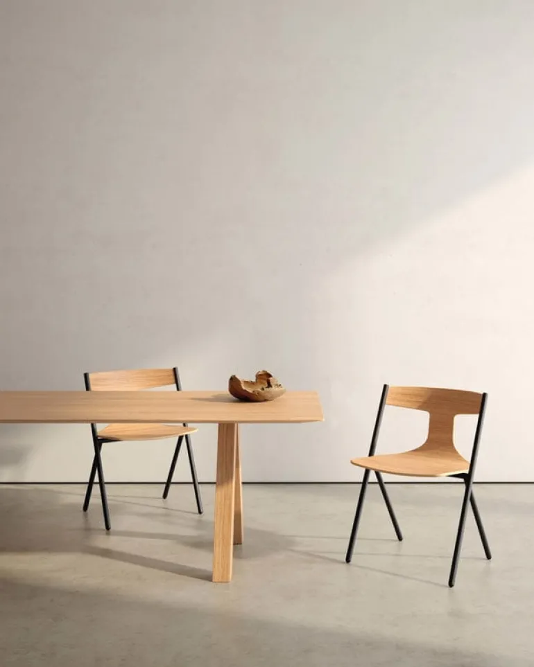 Viccarbe’s Quadra chair complements any decor with its beautifully balanced lines and architectural influences. Designed by Mario Ferrarini in 2019, the Quadra chair is composed of a diagonally constructed steel frame and a seat made of bent oak plywood. The combination of straight lines of the legs and soft shapes of the seat give the chair a charming, lively character. Manufactured by the Spanish company Viccarbe, the Quadra chairs are ideal for home use as well as offices, restaurants and other public spaces, as they are designed to withstand heavy use and are easy to stack in high yet sleek piles.
