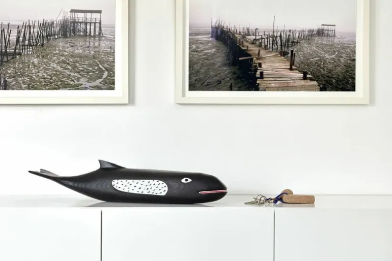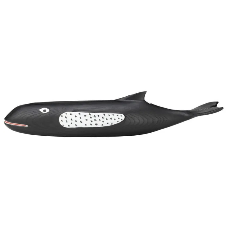 Eames House Whale is a delightful scale model of the huge, two-meter wooden whale that was one of the most beloved decorative objects in the house of Charles and Ray Eames. Crafted by an anonymous North American folk artist, the original whale hung from the ceiling of the Eames House, and it also appeared in several photoshoots of the Eames products. Manufactured by Vitra, the 70-cm-long Eames House Whale is made of hand-painted alder, and it brings joy whether placed on a table or windowsill or hung from the ceiling of your house.