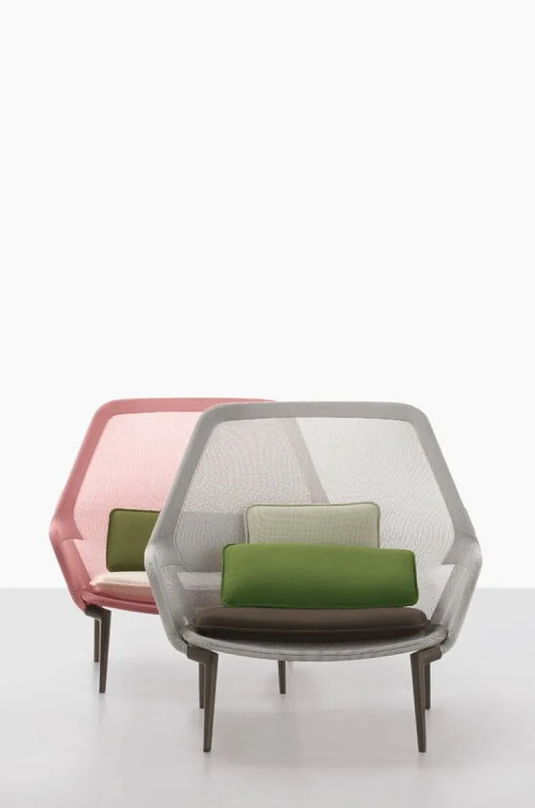 Vitra’s Slow Chair is an exceptionally light and comfortable armchair designed by Ronan and Erwan Bouroullec. The comfortability of Slow Chair comes from the fabric sling cover that is stretched over the metal frame. Despite its generous size, the Slow Chair is a lightweight and easily movable furniture, and the translucent knit emphasizes its lightness. The combination is perfected with thin seat and back cushions and appealing colors.