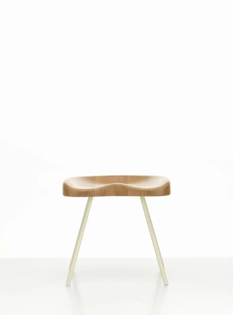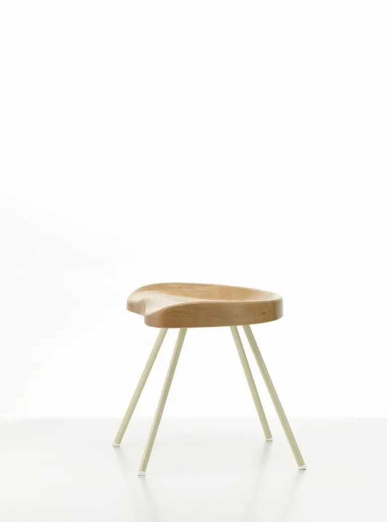 Vitra’s Tabouret N° 307, or “stool number 307”, consists of graceful steel legs and a fascinatingly unusual wooden seat, whose ergonomic shape is reminiscent of a traditional tractor seat. Created by French designer, architect and engineer Jean Prouvé, the stool’s original design dates back to the 1950s. Almost 70 years later, in 2022, Vitra re-released the stool in shades inspired by Prouvé’s original color palette.