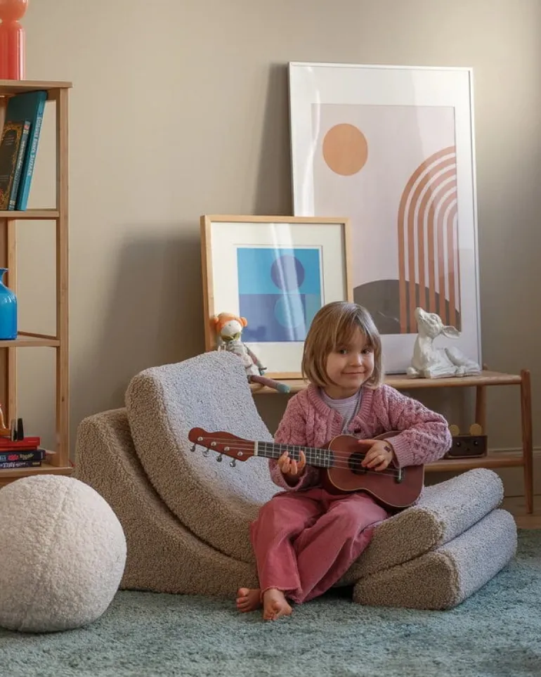 The Moon chair is filled with polyurethane foam and upholstered with a removable teddy fabric cover. The smooth fabric is made of recycled PET bottles – so the chair is actually giving a new life to plastic that has already once been used!