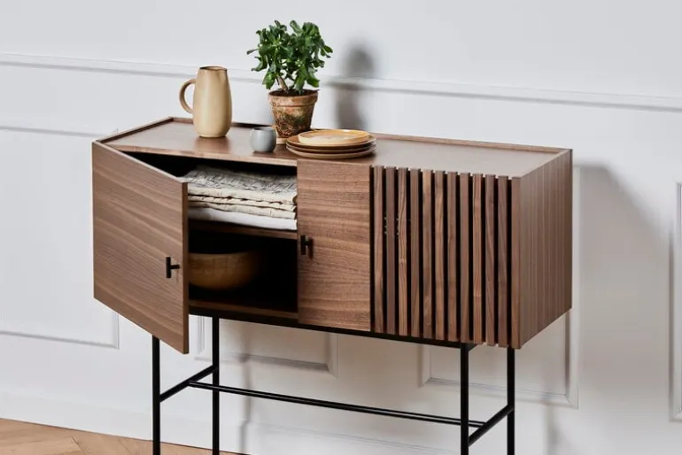 Array sideboard by Woud combines a slim metal frame with an walnut-veneered cabinet. Design studio Says Who found inspiration for the vertical slates of the door from modern architecture. Behind the doors, you’ll find four convenient compartments for storing tableware, clothes, toys as well as office supplies. The play of light and shadows gives Array a refined but distinctive appearance that will complement all kinds of interiors.