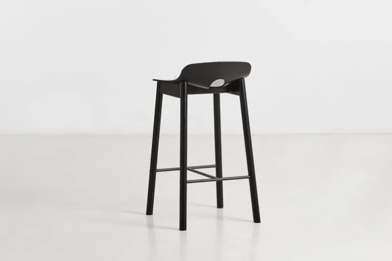 Mono bar stool by Woud reshapes traditional Scandinavian wood design with a new plywood technique. Created by the Finnish designer Kasper Nyman for the Danish brand Woud, Mono chairs were inspired by a shape of a folded paper cone – the overlapping construction of the seat is enabled by a thermoformable Grada wood that can be shaped into more challenging forms than ordinary plywood. The result is a smooth, simple and extremely sophisticated wooden chair, perfected with a beautiful drop-shaped hole. The chairs of the Mono collection are manufactured in Denmark.
