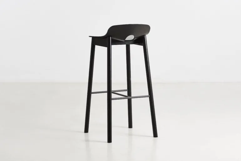 Mono bar stool by Woud reshapes traditional Scandinavian wood design with a new plywood technique. Created by the Finnish designer Kasper Nyman for the Danish brand Woud, Mono chairs were inspired by a shape of a folded paper cone – the overlapping construction of the seat is enabled by a thermoformable Grada wood that can be shaped into more challenging forms than ordinary plywood. The result is a smooth, simple and extremely sophisticated wooden chair, perfected with a beautiful drop-shaped hole. The chairs of the Mono collection are manufactured in Denmark.