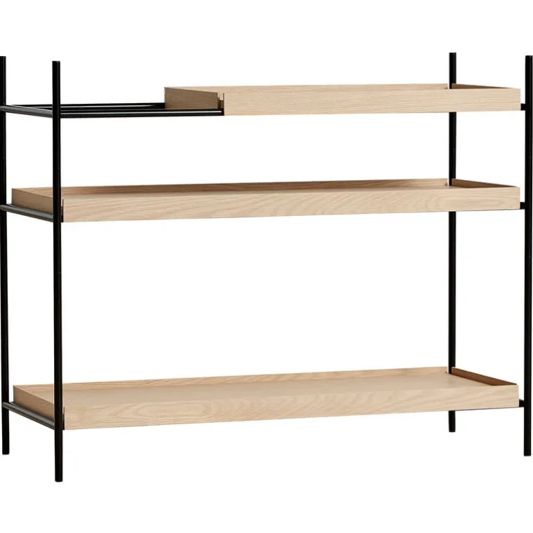 Tray shelf by Woud consists of a thin metal frame and wooden shelves in two sizes: the smaller, tray-like shelves provide space for higher books, vases and other objects. The shelves can be arranged freely on different levels in the frame. Designed by Hanne Willmann, Tray shelves are a harmonious combination of German solid construction and Japanese airy elegance.