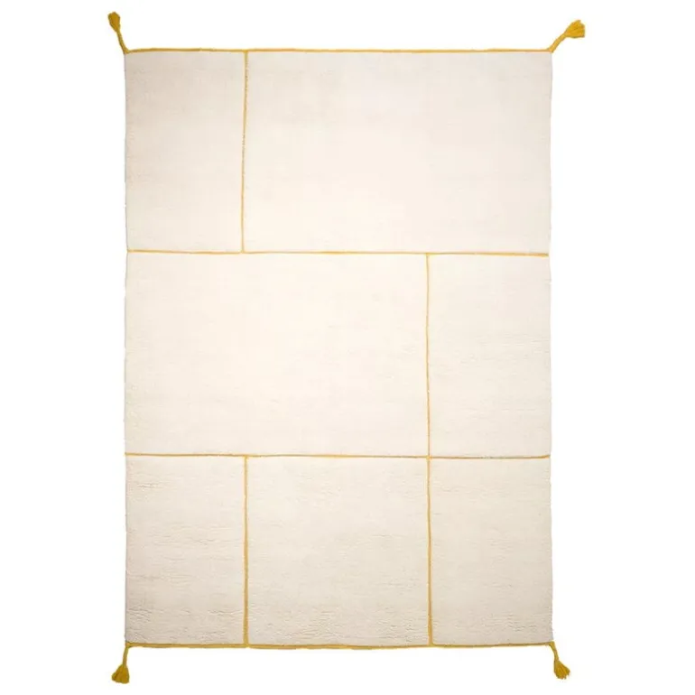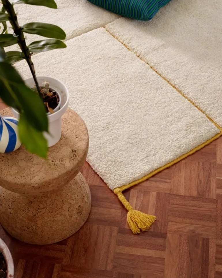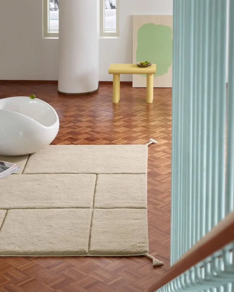 Woven Works’ Line 02 rug delights with the softness of high-pile wool and the simplicity of geometric lines. The off-white shaggy wool rug is divided into sections formed by yellow, grooved lines, giving the rug an interesting three-dimensional expression. The design is perfected with braided, yellow fringes on the corners.