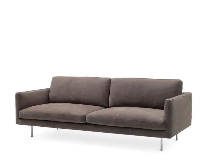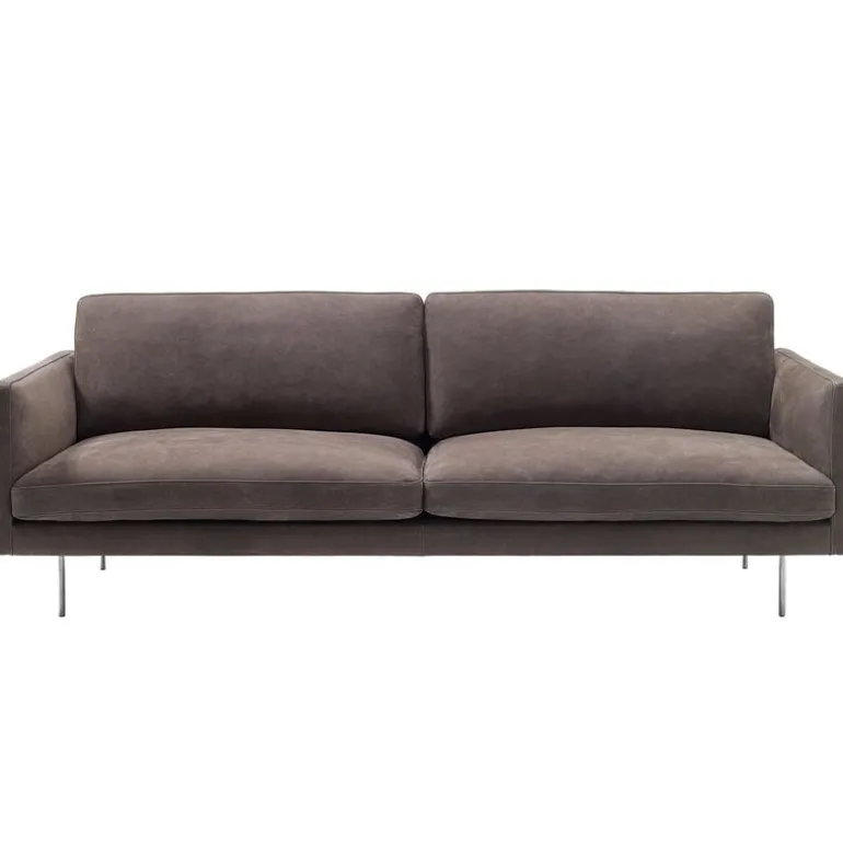 Basel sofa by Adea charms with a combination of angular shapes, relaxed comfortability and balanced proportions. Upholstered in fine, velvety nubuck leather, the seat of the sofa rests on sleek aluminum legs that give it an airy, hovering character. Feather-filled cushions complement the sofa with natural softness and feeling of luxury.