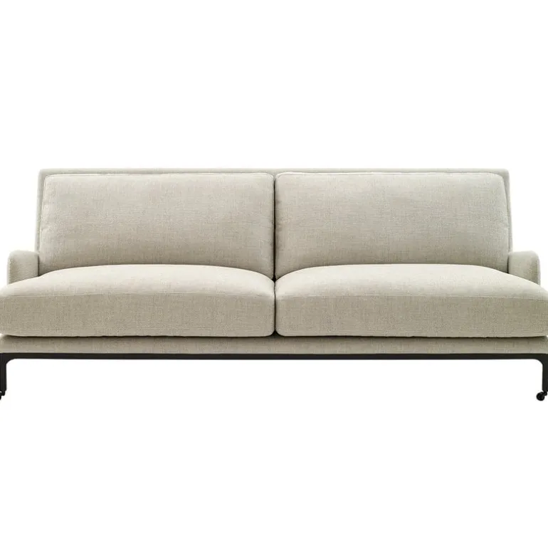 Mr. Jones sofa by Adea is characterized by light, flowing lines and generous, clear-lined cushions contrasted by a black metal frame with castors on the front.
