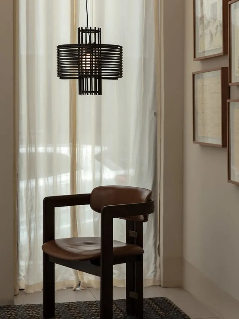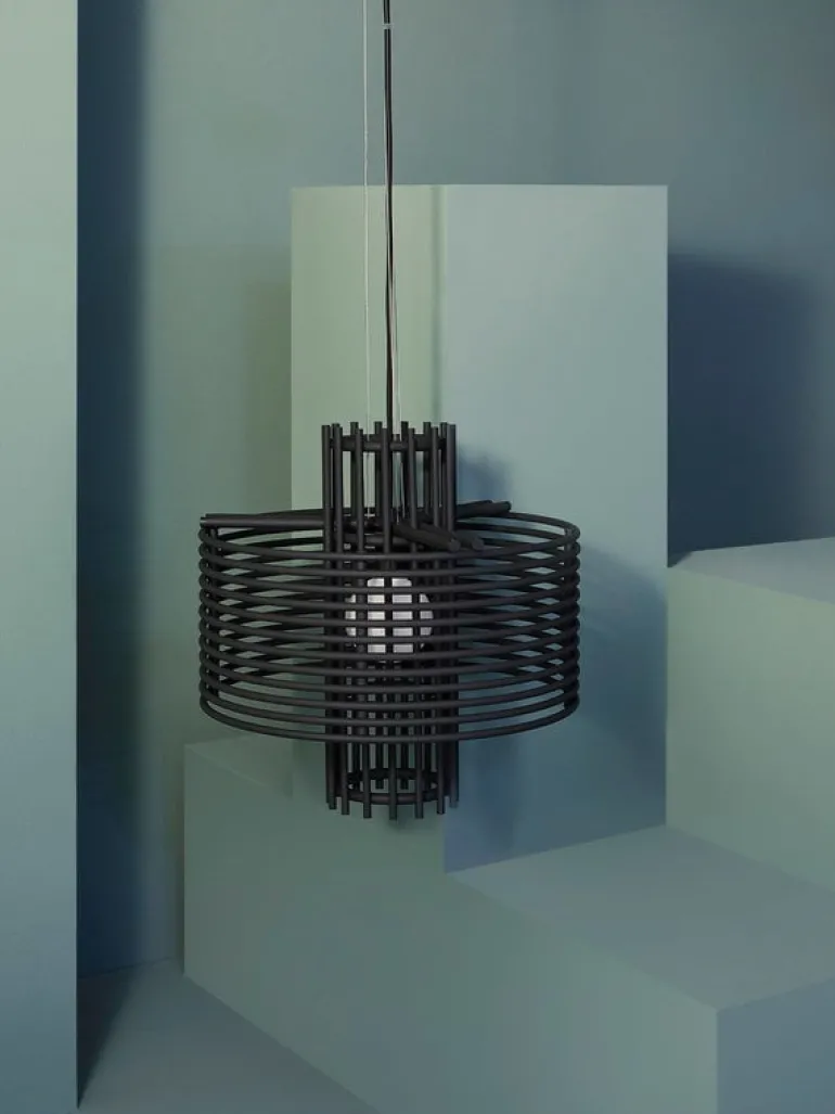 AGO’s Nova pendant light, designed by Jinsik Kim from South Korea, in an abstract interpretation of the wonders of outer space. The fascinating appearance of the Nova lamp results from vertical and horizontal metal structures in overlapping rings, inspired by supernova explosions and old sci-fi movies. The impression of the pendant light alternates continuously depending on the viewing angle, and the bold, geometric elements create a stunning setting for the light source placed inside a round opal glass diffuser.