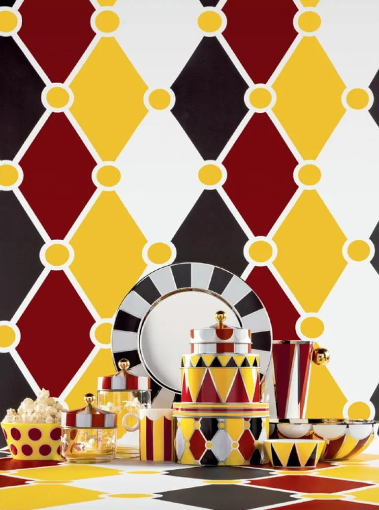 Circus is a playful kitchen and serving collection designed by Marcel Wanders for the Italian design brand Alessi. The collection was inspired by the ambience of old, colorful circus tents, where bright shades of yellow and red combine with strong black and white patterns and the shine of gold and silver. The Circus collection transforms the delightful spirit of old-time circus into a modern shape and fills the table with joyful atmosphere.