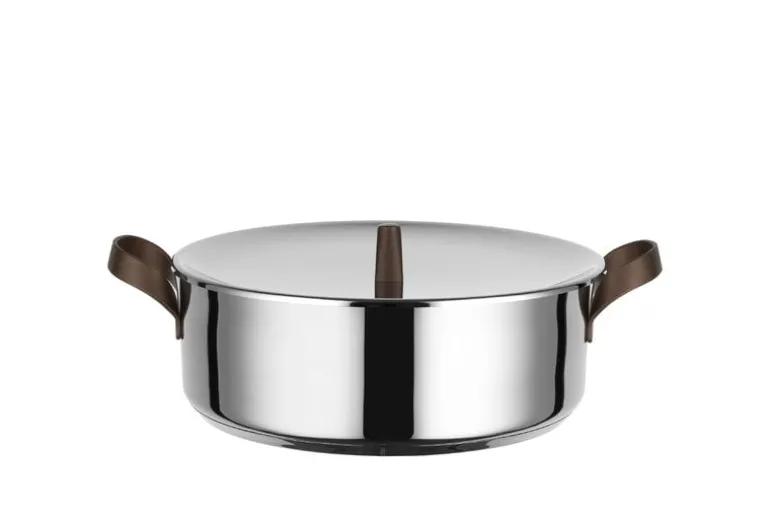 The Edo cookware set by Alessi consists of four stainless steel pots and pans with three lids, including: