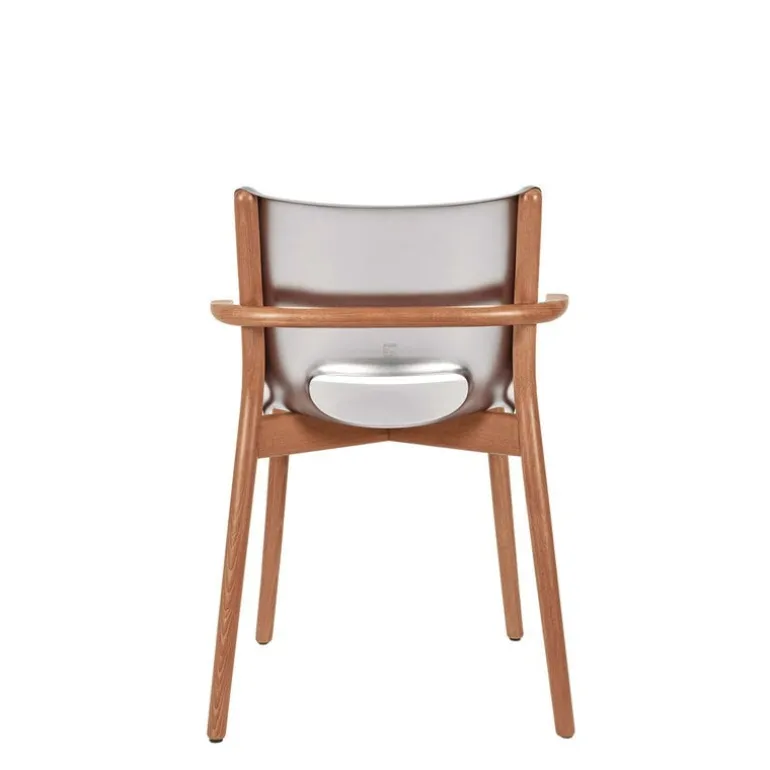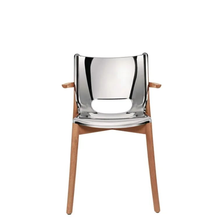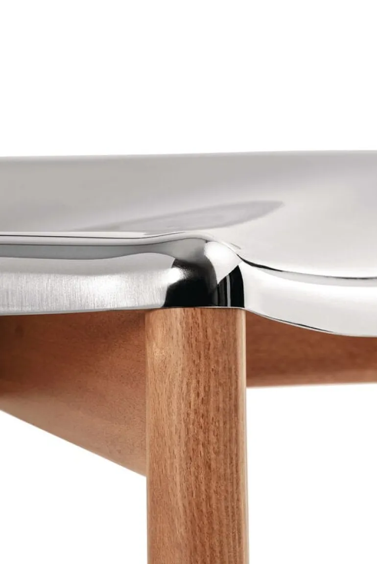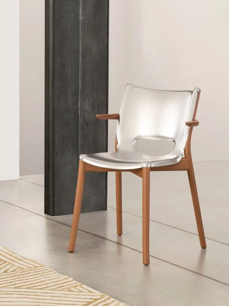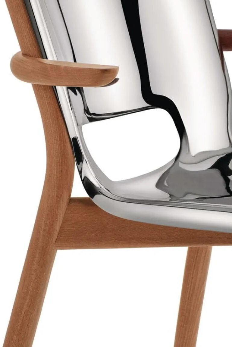 Alessi’s Poêle chair, created by the design maestro Philippe Starck, is a marvel of steel craftsmanship. Imagine rigid sheets transforming into a fluid dance around wooden elements with a distinct identity, seamlessly fitting into diverse environments – homes, offices, or high-end projects.