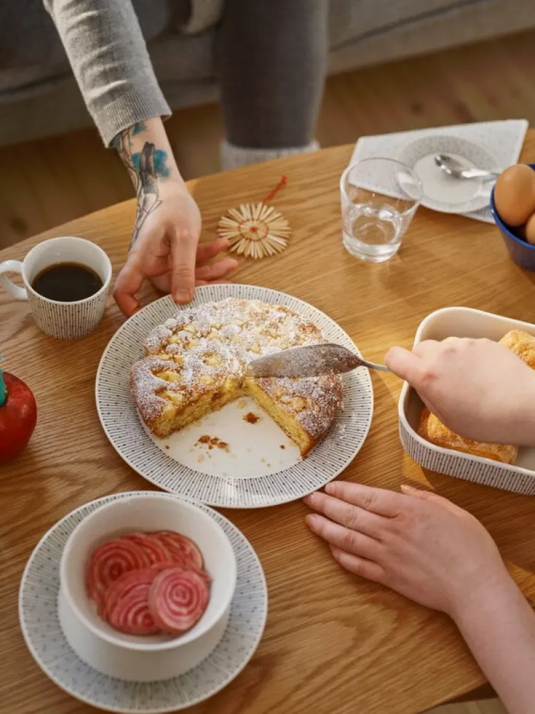 Mainio Sarastus is a tableware collection launched by Arabia in 2018, designed to bring beauty and practicality especially to small kitchens and urban homes. The most essential elements in its product design were versatility, durability and stackability: besides dining, the ceramic tableware is designed for preparing and storing food, and the plates can be used as lids for the bowls.
