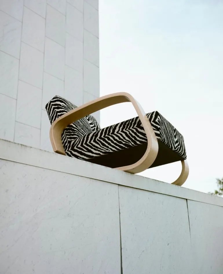 Artek’s Armchair 400, also known as Tank, is one of the absolute milestones in furniture design of the 1900s. Alvar Aalto designed the Tank chair in 1936 for the Milan Triennale. The voluminous chair attracted much attention and was awarded during the fair. Armchair 400 was an exception compared to Aalto’s previous pieces of furniture both for its shape and for its premises: previously had Aalto designed all his chairs for a certain architecture destination, but the Tank was designed as commission work for the Triennale. The sturdy seat and the wide armrests offer a comfortable seating experience and give the chair its characteristic, tank-like appearance. The lightness seen in Aalto’s first chairs had now changed into a more massive look and the barycentre had become lower, but the appearance is still airy and organic. Armchair 400 is available in several upholstery options: the zebra fabric is one of the original upholsteries.