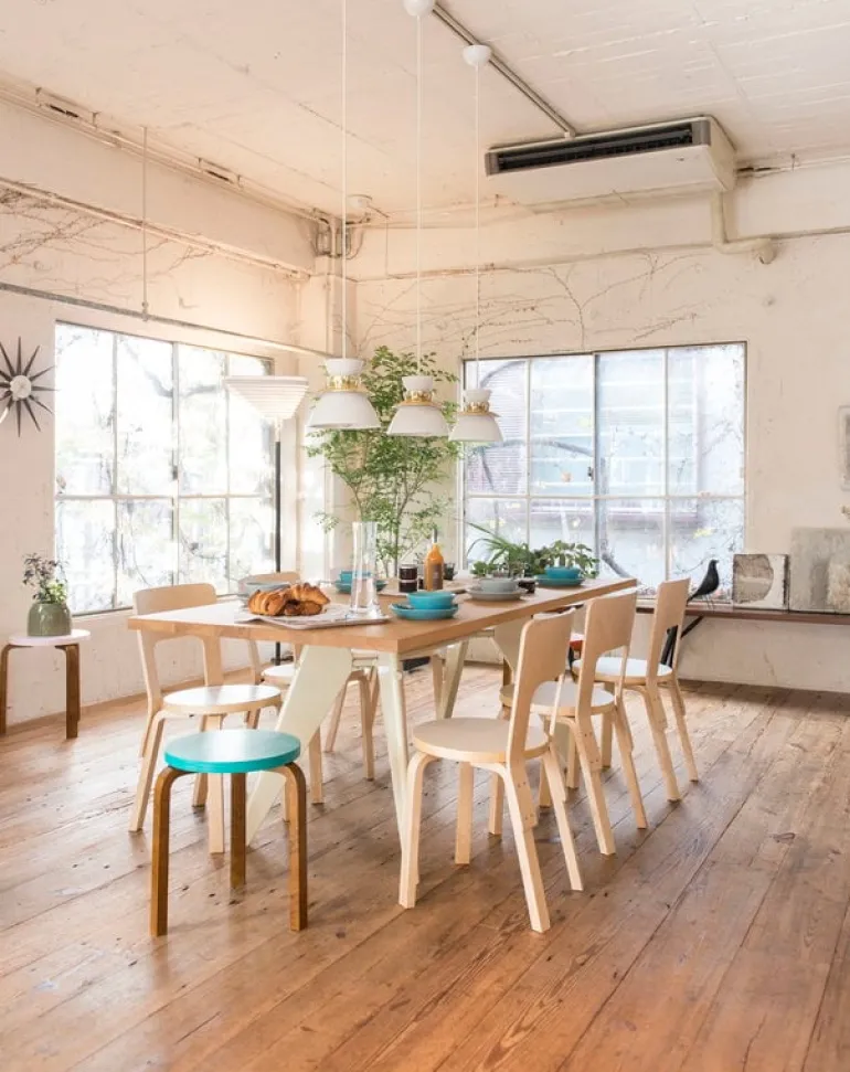 Artek’s Chair 66, designed in 1935, is one of the most popular dining chairs of Alvar Aalto and part of the permanent collection of MoMA, The Museum of Modern Art in New York. The timeless chair features Aalto’s patented L-leg structure, which allows the legs to be attached directly to the round seat. Compared to his other dining chairs, Chair 66 has a higher backrest that makes it comfortable to sit on and gives the design its distinct look.