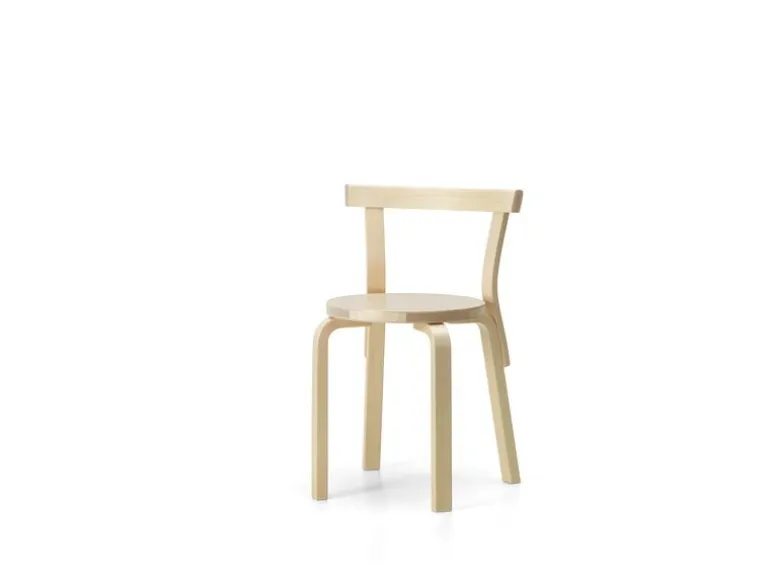 Chair number 68 by Artek is easily recognized as a piece of furniture designed by Alvar Aalto: it features the typical round seat as well as the signature L-leg structure that allows the legs to be attached directly to the seat. Chair 68 can be distinguished from other Aalto chairs by its thinner backrest. In order to save space, Chair 68 is stackable up to four chairs.