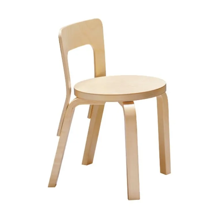 N65 chair by Artek is a re-sized children’s model of the famous Chair 65 designed by Alvar Aalto in 1935. Made of light-colored birch wood, N65 chair is characterized by rounded shapes, bent L-legs and a sturdy back that offers a great seating comfort for playing, writing, drawing, dining and other activities. N65 chair is a Scandinavian design classic of the children’s room – its simplistic look complements all kinds of interiors, and its seating height of 14.96 in (38 cm) fits easily together with small tables.