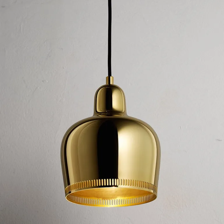 Golden Bell Savoy is a new version of A330S pendant launched in 2017 for the 80th anniversary of the Restaurant Savoy in Helsinki. The Golden Bell pendant was originally designed by Alvar Aalto for the Restaurant Savoy in 1937. Like the other A330S pendants, Golden Bell Savoy is made of one single piece of brass, but its polished surface has been left uncoated, so over time, it will develop a beautiful and unique patina. Unpolished inside of the lamp creates a warmer light than the other models of the series. The pendant is equipped with a brass canopy and a black textile cable, and it resembles closely Aalto’s first versions of the A330S lamps which are still in use at Restaurant Savoy.