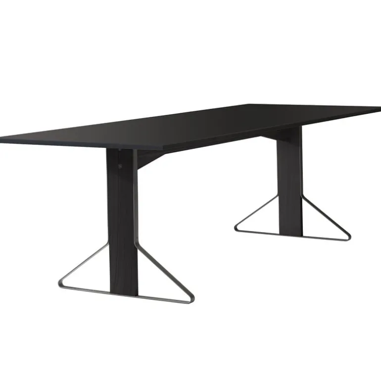 Artek’s Kaari table REB 001 features a table top made of black linoleum. Its length is 78.74 x 0 in (200 x cm, cm), width 33.46 in (85 cm) and thickness 0.94 x 0 in (2,4 x cm. cm). The materials of the base are black stained oak with protective varnish and black powder coated steel.