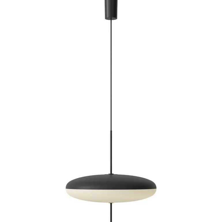 The Model 2065 pendant lamp is composed of two joined saucers that merge into a round, flat diffuser. Five LED lamps make the pendant light bright enough for larger spaces as well, and the thin wire and black, stick-like base give the lamp its finishing touch. The luminaire has been manufactured in Italy.