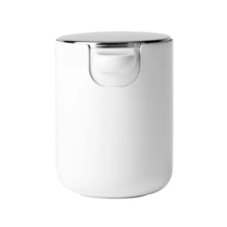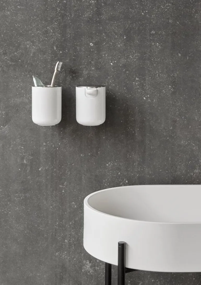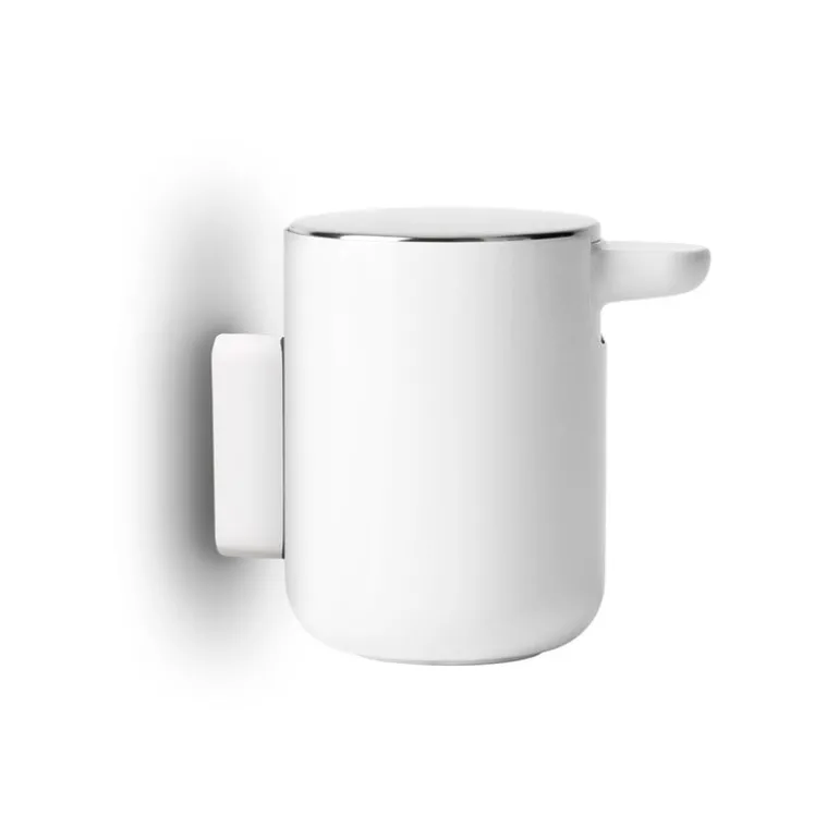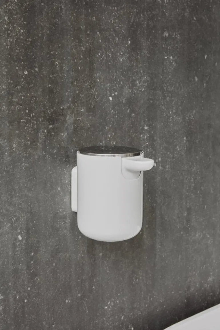 Audo Copenhagen’s practical soap dispenser, designed by Norm Architects, can be mounted to the bathroom wall. The dispenser not only saves space but is easy to clean, use and refill. A simple touch of the steel lid dispenses the soap.