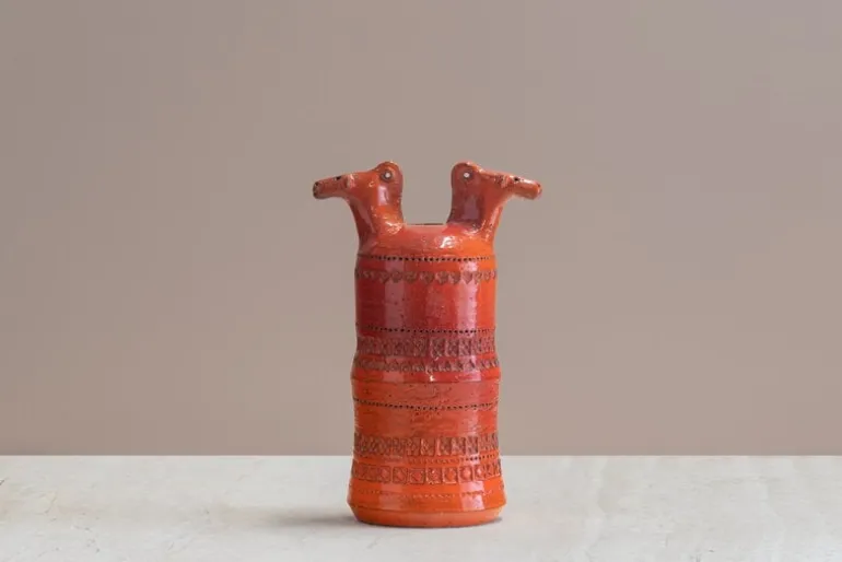 Bitossi’s horse heads vase figure celebrates the Italian company’s long history. The decorative piece, originally known in Italian as “Vaso con figure di cavallo”, is part of a ceramic art collection designed by Aldo Londi in the 1960s, which, to the delight of ceramic lovers, was re-released in 2003. The abstract vase is a rarity that will interest collectors, too: only 199 pieces of this red vase have been produced! Each piece in the limited edition is marked with an individual number and the Cav G. Bitossi & Figli stamp.