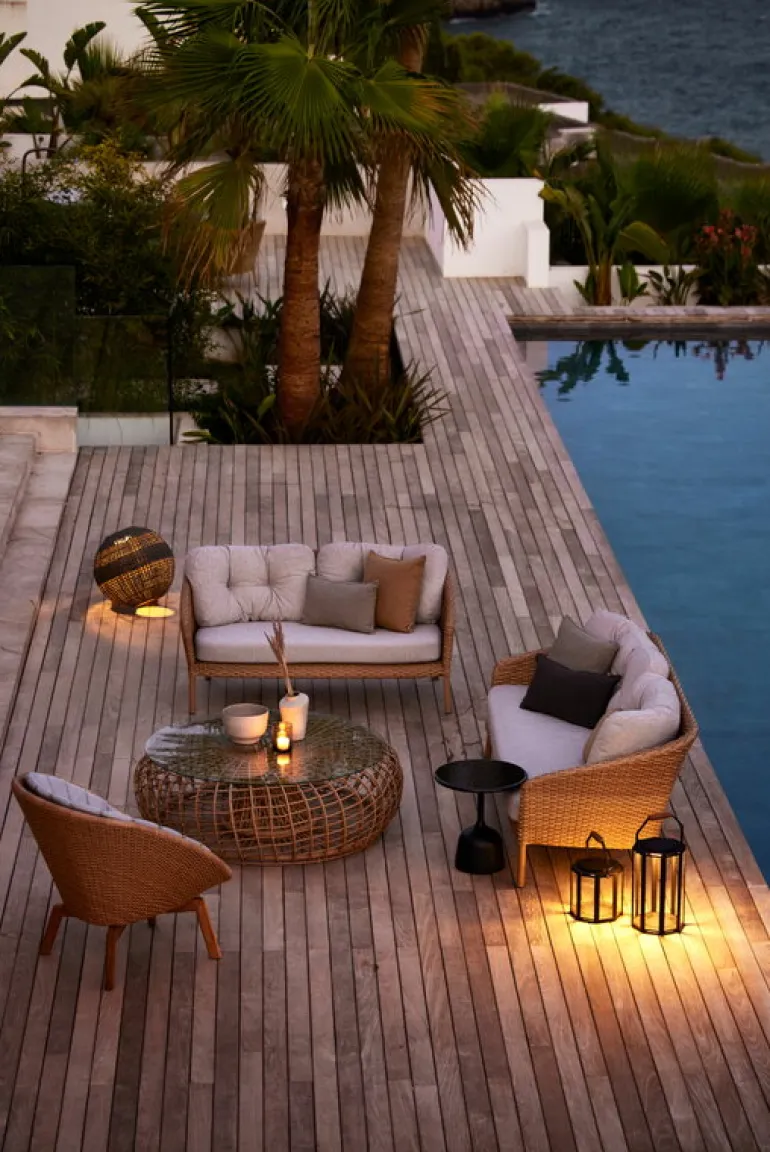 The Cane-line Ocean sofa adds a charming combination of modern design and traditional craftsmanship to any outdoor area: the aluminum frame of the patio sofa is decorated with a rattan-like weave, which gives it a light and inviting but at the same time distinctive look.