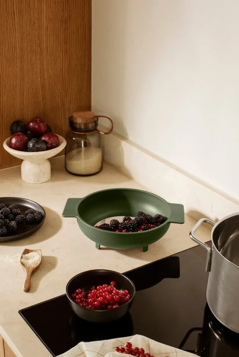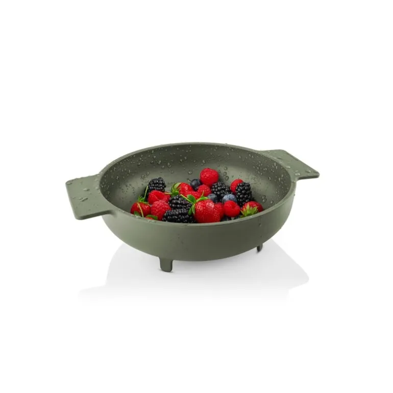 Eva Solo’s Green Tool sieve is a multifunctional tool designed for a variety of purposes: you can use it to sift fine ingredients, such as flour or icing sugar, to strain sauces or pasta or to rinse fruit and veggies. It is basically a sieve, a sifter, a strainer and a colander in one! The fine-meshed sieve is complete with minimalist handles and four feet that allow you to place it directly on the kitchen table top. The sieve fits cooking pots with a diameter of 16, 20 and 9.45 x 0 in (24 x cm. cm).