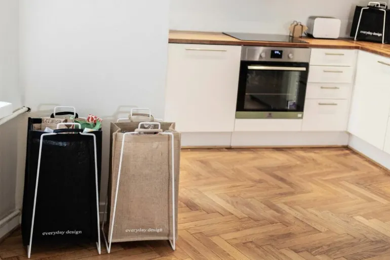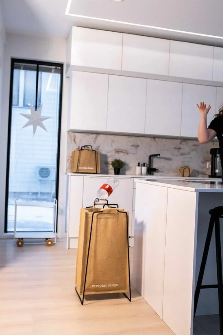 Everyday Design’s Turku XL jute bag complements the look and functionality of the Turku bag holder. The sustainable bag is a handy helper for collecting bottles, cardboard and other recyclable items, but can also be used on its own as a big shopping bag, laundry basket or storage unit. The jute bag features a minimalist Everyday Design logo on the other side as well as a handy flap on the inside to hide its content from curious eyes.