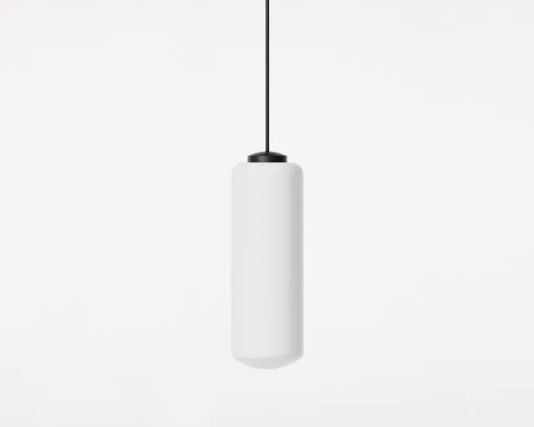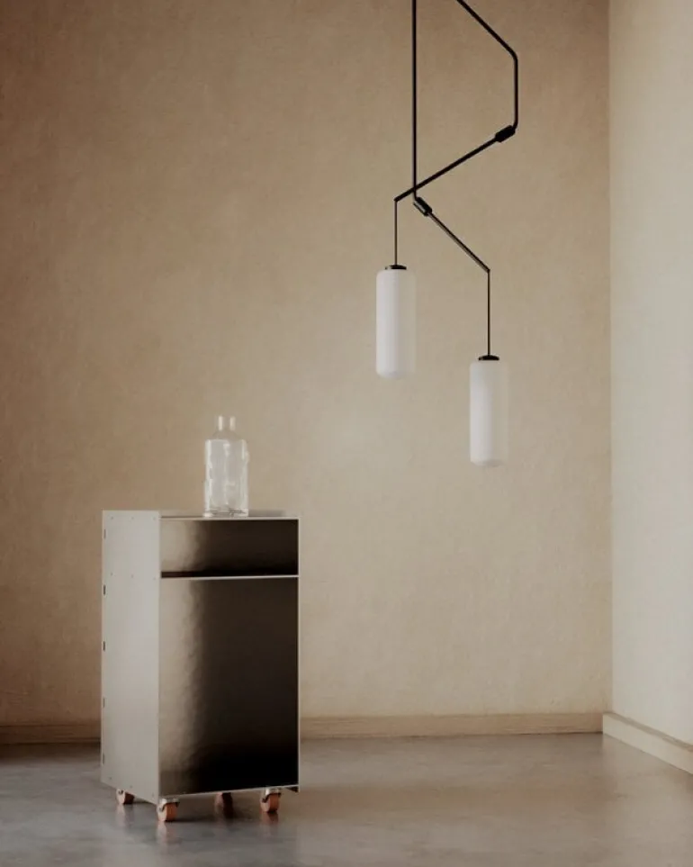 Frama’s Ventus pendant catches the eye with its architectural form conceived by the Danish design duo Included Middle. The pendant light comprises a sculpturally bent suspension tube and a cylindrical shade in opal glass that filters the light softly and pleasantly, creating a warm and inviting atmosphere in the space.