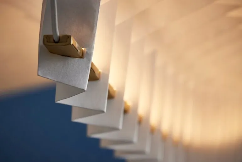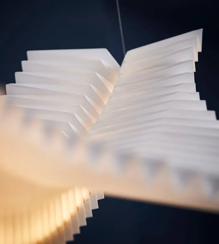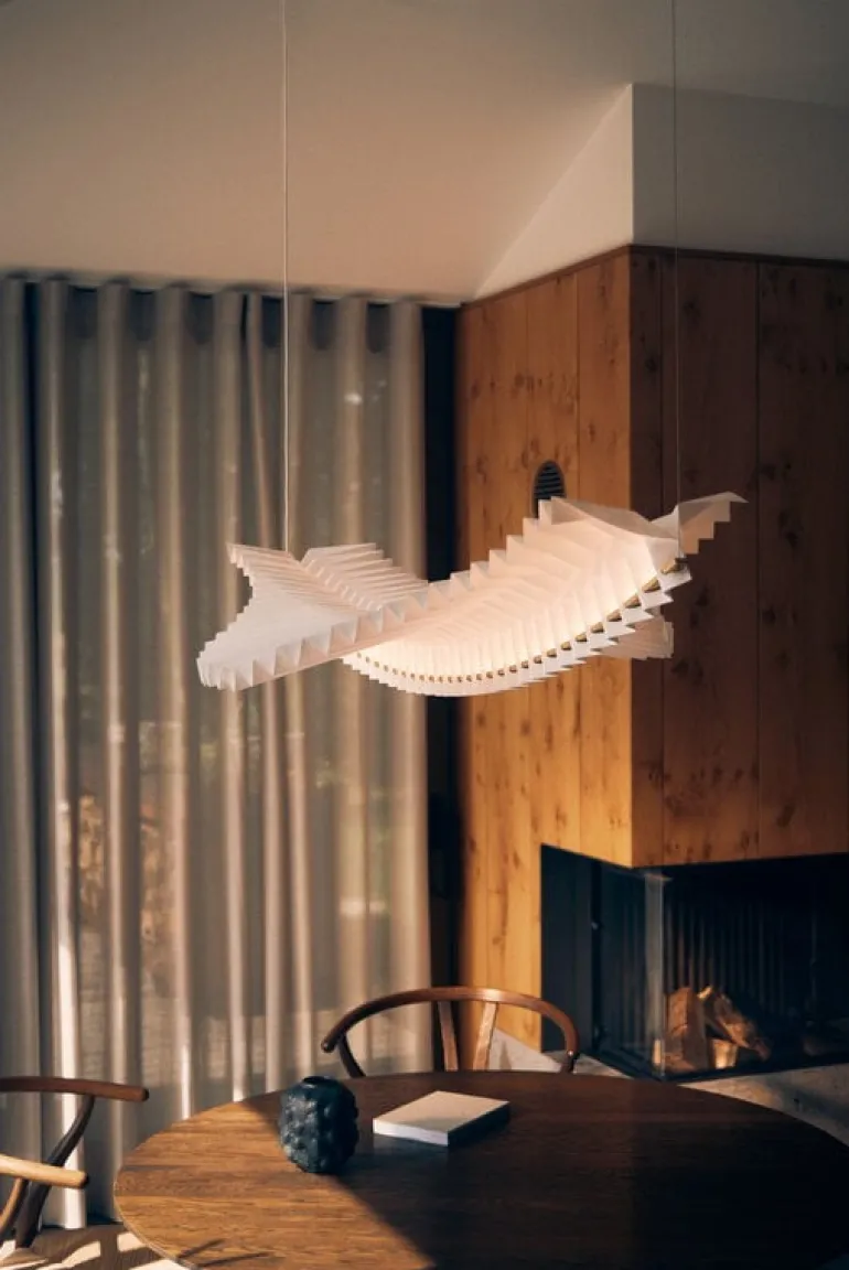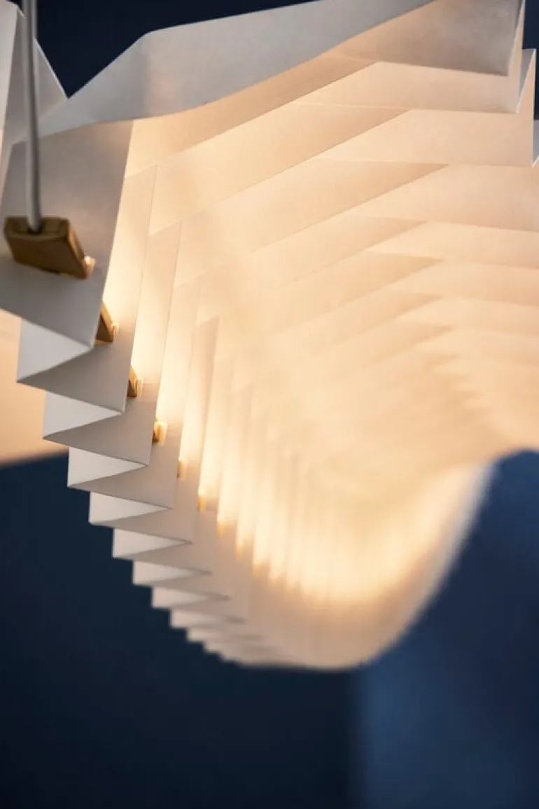 Designed by Studio Fung & Bedford, the Sora pendant is made from lightweight yet durable Tyvek paper using traditional Japanese origami paper-folding techniques. The graceful appearance is topped off with brass-colored metal details.