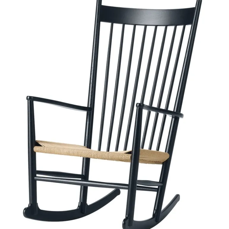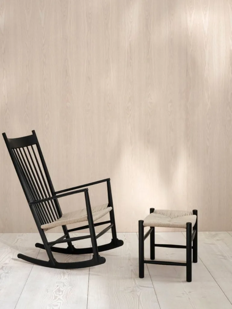 Fredericia’s J16 is a wooden rocking chair designed by Hans J. Wegner in 1944. The rocking chair is characterized by elegant, curved lines and spindles inspired by English Windsor chairs. The seat has been corded by hand from natural paper yarn.