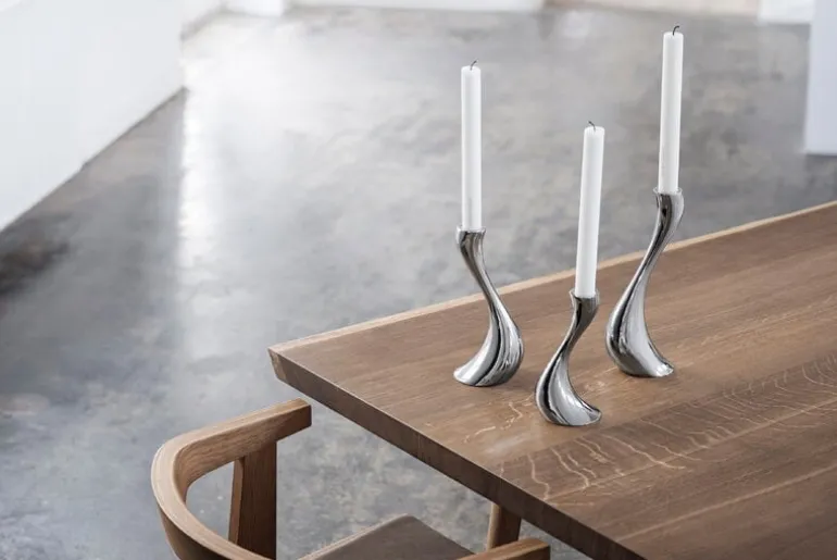 Georg Jensen’s Cobra candleholders catch the eye with the shine of mirror-polished steel. The organic lines of the candleholders resemble melting wax – almost as if a classic candlestick had started to melt.
