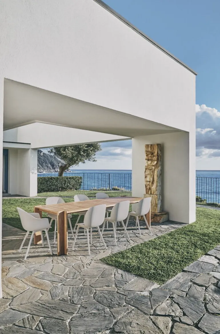 The Atmosfera table boasts an architectural and perhaps a little maritime-inspired design. Over time and use, the table will also become even more distinctive: teak is a classic outdoor material that ages beautifully, developing a lovely patina and turning into a sophisticated silvery gray tone. The table’s clever details and top-quality material elevate its minimalistic look and make Atmosfera the perfect addition to a variety of environments from a lush garden to an urban, more ascetic outdoor space.