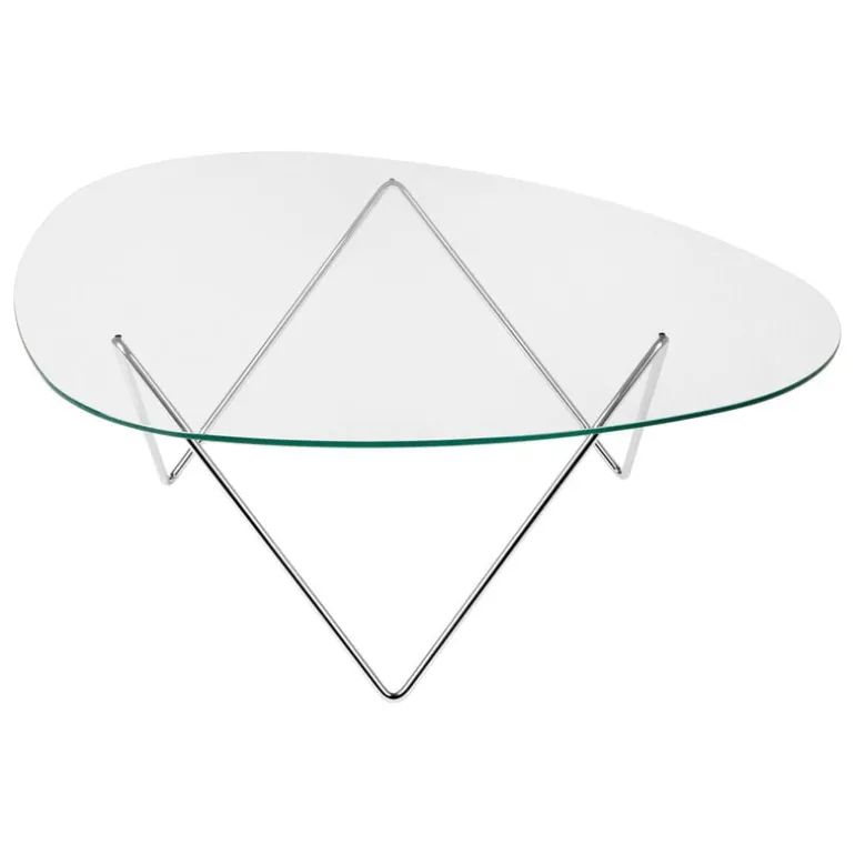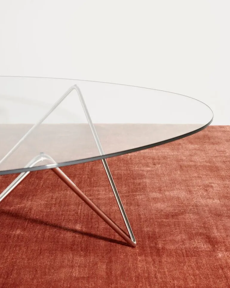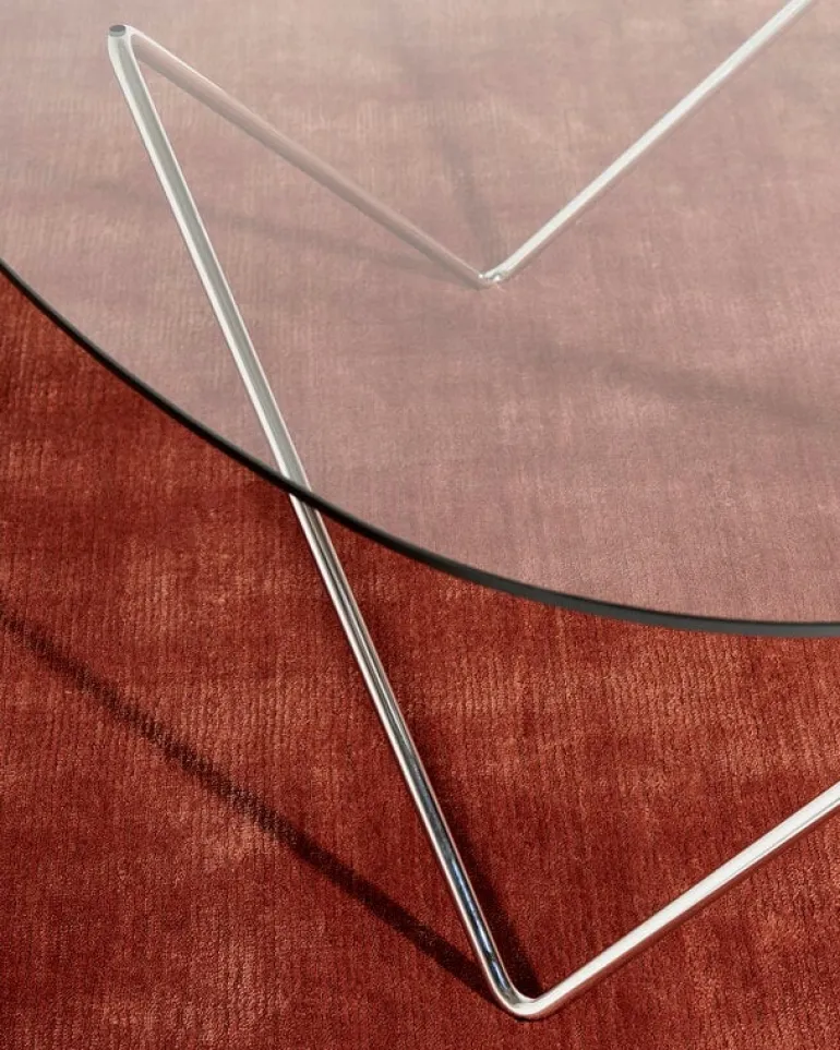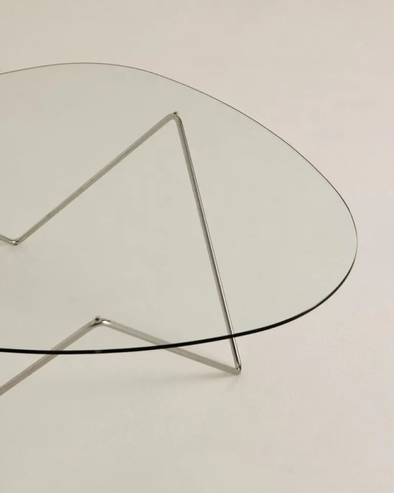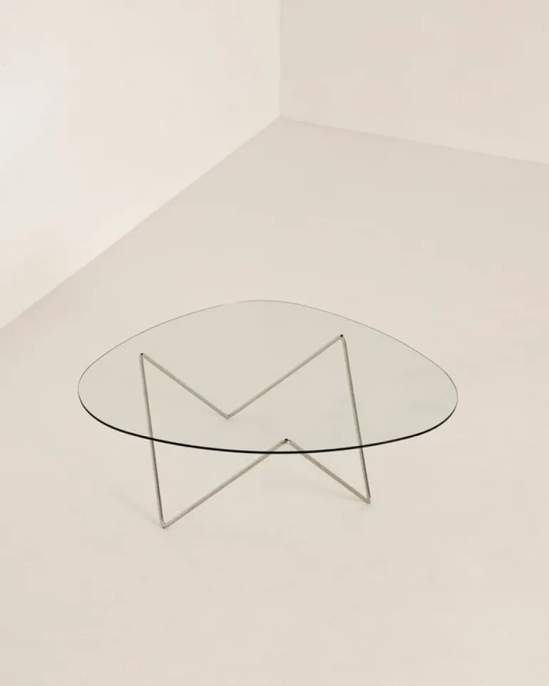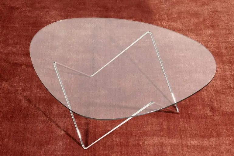 The Pedrera coffee table has a chromed steel frame and an organically shaped glass top. It pairs perfectly with the lamps from the Pedrera collection but also makes a distinctive eye-catcher by itself.