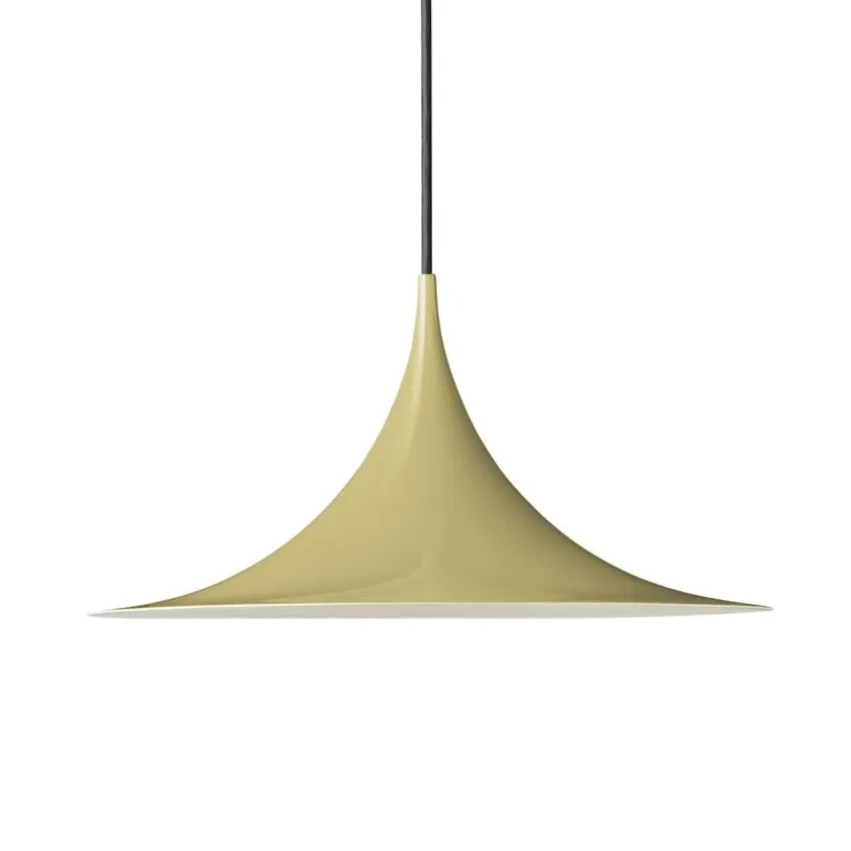 The Semi pendant lamp by GUBI charms with its playful, trumpet-shaped silhouette. The unique shape of the Semi lamp gives a wide spread of light around the room. The Semi pendant lamp was designed by designer duo Bonderup & Thorup, and it is available in various finishes from classic matt tones to shiny metal and colorful glossy shades. In a larger space, you can also create a unique cluster by combining several different-sized and colored Semi pendants together.