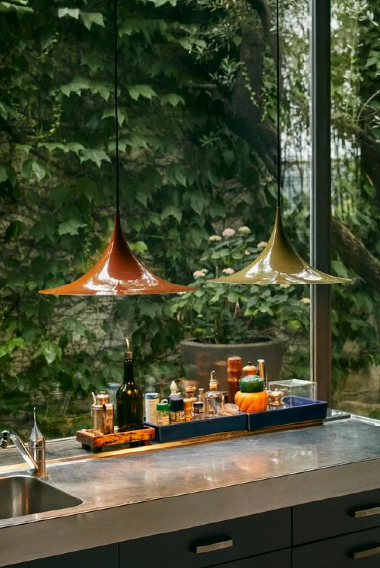 The Semi pendant lamp by GUBI charms with its playful, trumpet-shaped silhouette. The unique shape of the Semi lamp gives a wide spread of light around the room. The Semi pendant lamp was designed by designer duo Bonderup & Thorup, and it is available in various finishes from classic matt tones to shiny metal and colorful glossy shades. In a larger space, you can also create a unique cluster by combining several different-sized and colored Semi pendants together.
