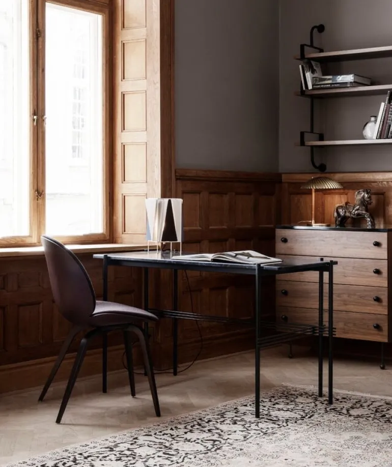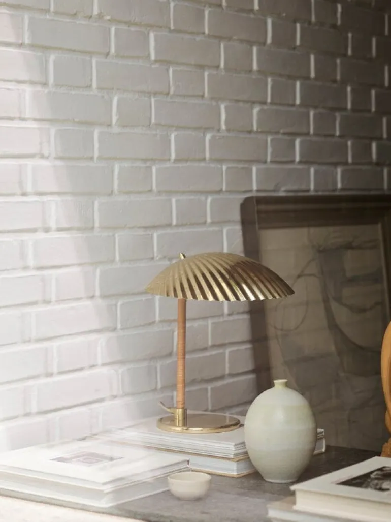 GUBI’s Tynell’s 5321 table lamp is also known as the Shell Lamp due to its brass shade resembling a seashell. Designer Paavo Tynell found his inspiration for the 5321 lamp from the nature and Romantic era, and the luminaire’s simplified appearance also echoes influences from mid-century modernism. Located right under the shell-shaped shade, the light bulb is reminiscent of a bright, glowing pearl. The organic appearance of the brass surfaces is complemented by a rattan-covered stem.