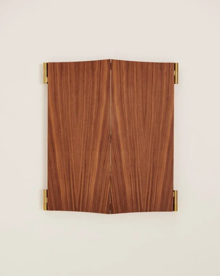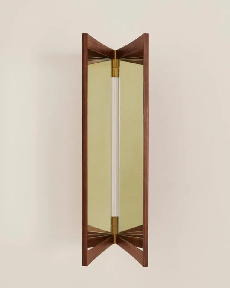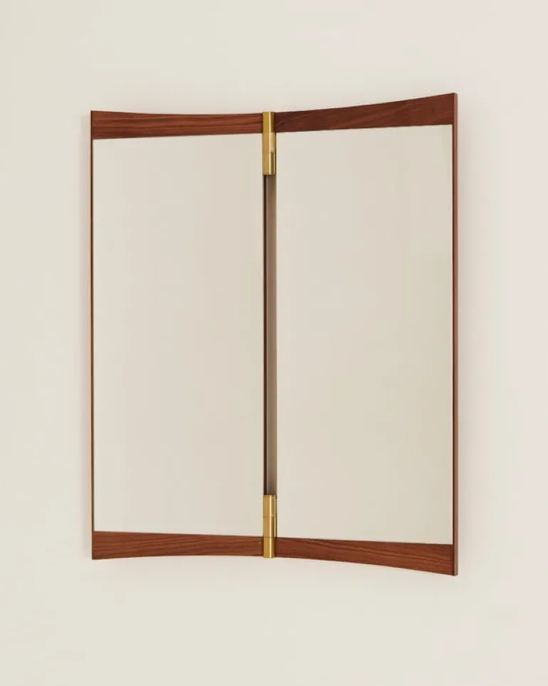 GUBI’s Vanity wall mirror got both its name and inspiration from 17th-century mirror tables. The vanity tables of that time featured mirrored panels that allowed the person sitting at the table to mirror themselves from several angles at once. In the Vanity wall mirror, the table itself has been removed, but the idea remains the same: walnut framed mirrors, connected by elegant brass hinges, allow the viewer to admire their reflection from different angles at the same time.
